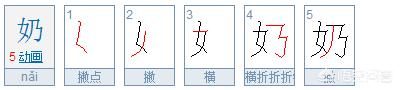 “奶”的笔顺共5画,在写法技巧上应该注意:左窄右宽。“女”两撇平行,间距适中,横画左伸。“乃”宽窄得当,斜中求正,位置比左部略低。