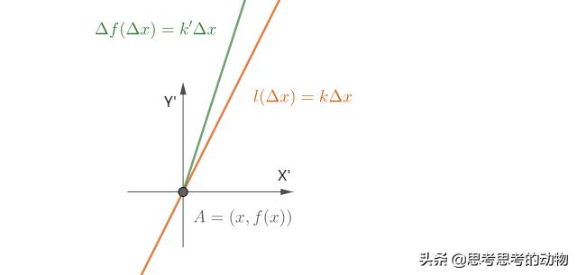 这样,对于绿色曲线 (Δf(Δx) - l(Δx)) / Δx = (k'-k) 显然是非零常数,就被排除了。