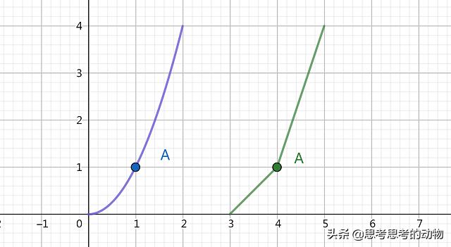 某些生活经验(比如:膝盖不小心撞上去的感觉)告诉我们,两个曲线在A点处的特性不同: