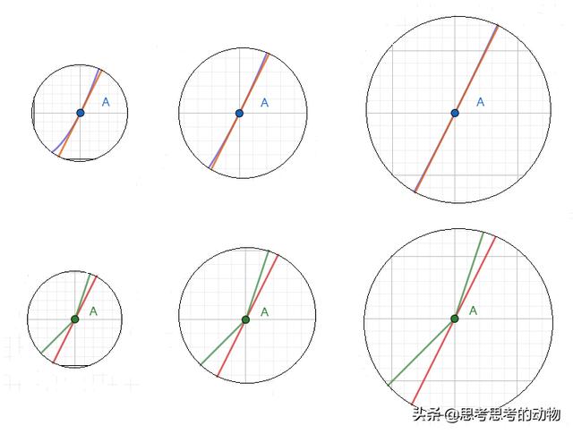 观察发现,随着局部的不断放大,两种特性的差异表现明显,在A点处圆润的 蓝色曲线 和 直线越来越 贴近,而A点处棱角的 绿色曲线 则和 直线 毫不相干。