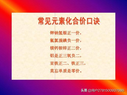 一价氢锂钠钾银,二价氧钙钡镁锌,定价除氧都是正,三铝四硅五价磷。变价元素记七种,铁碳氯氮硫铜锰,二三铁,二四碳,一二铜,三五氮,二四六七锰特殊,硫价常显二四六,氯常显负一,还有正一三五七。